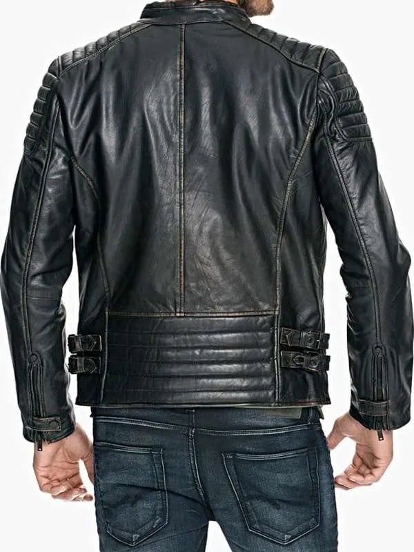 Men's Distressed Black Goatskin Leather Jacket – Quilted Shoulders, Slim Fit, Zipper Closure & Stand-Up Collar