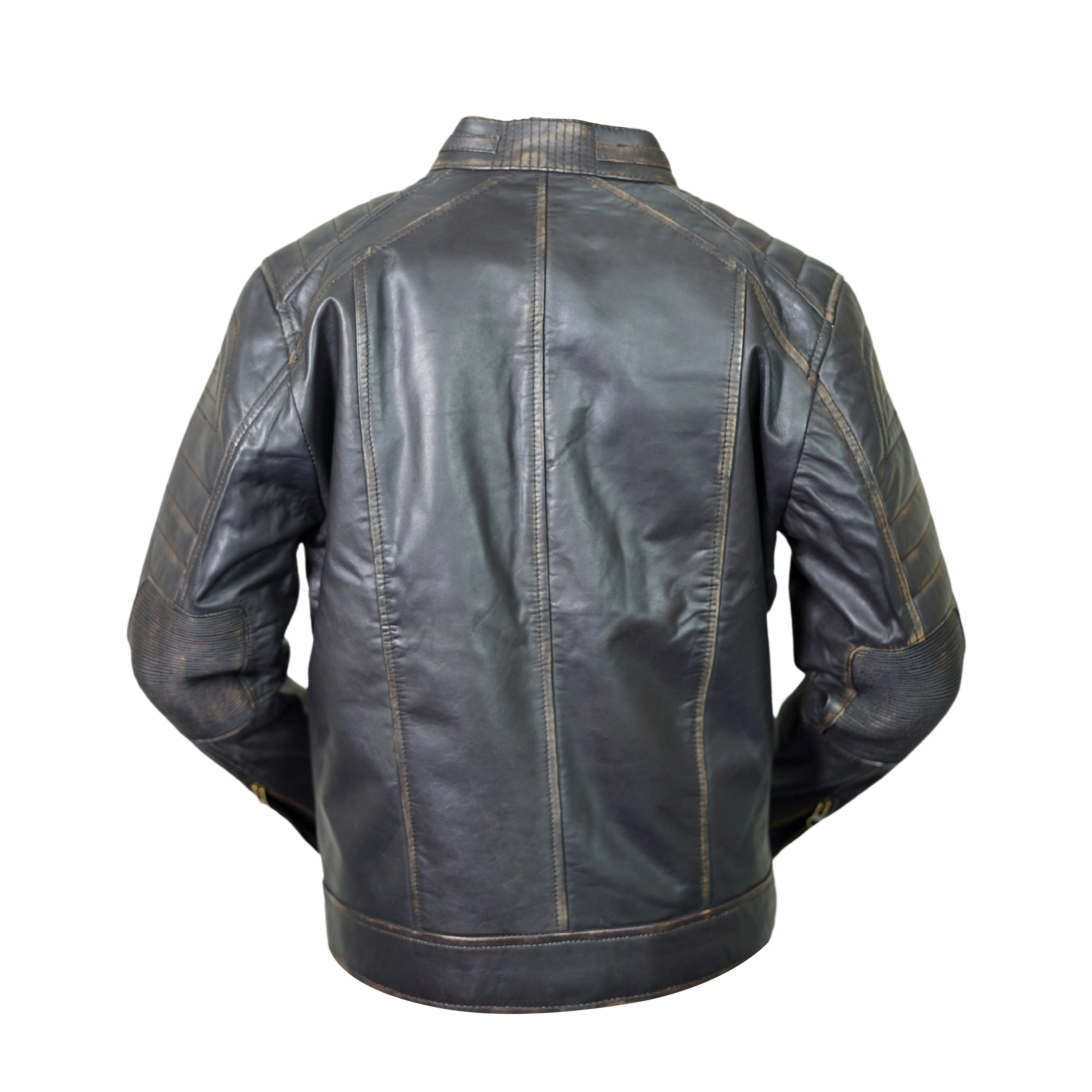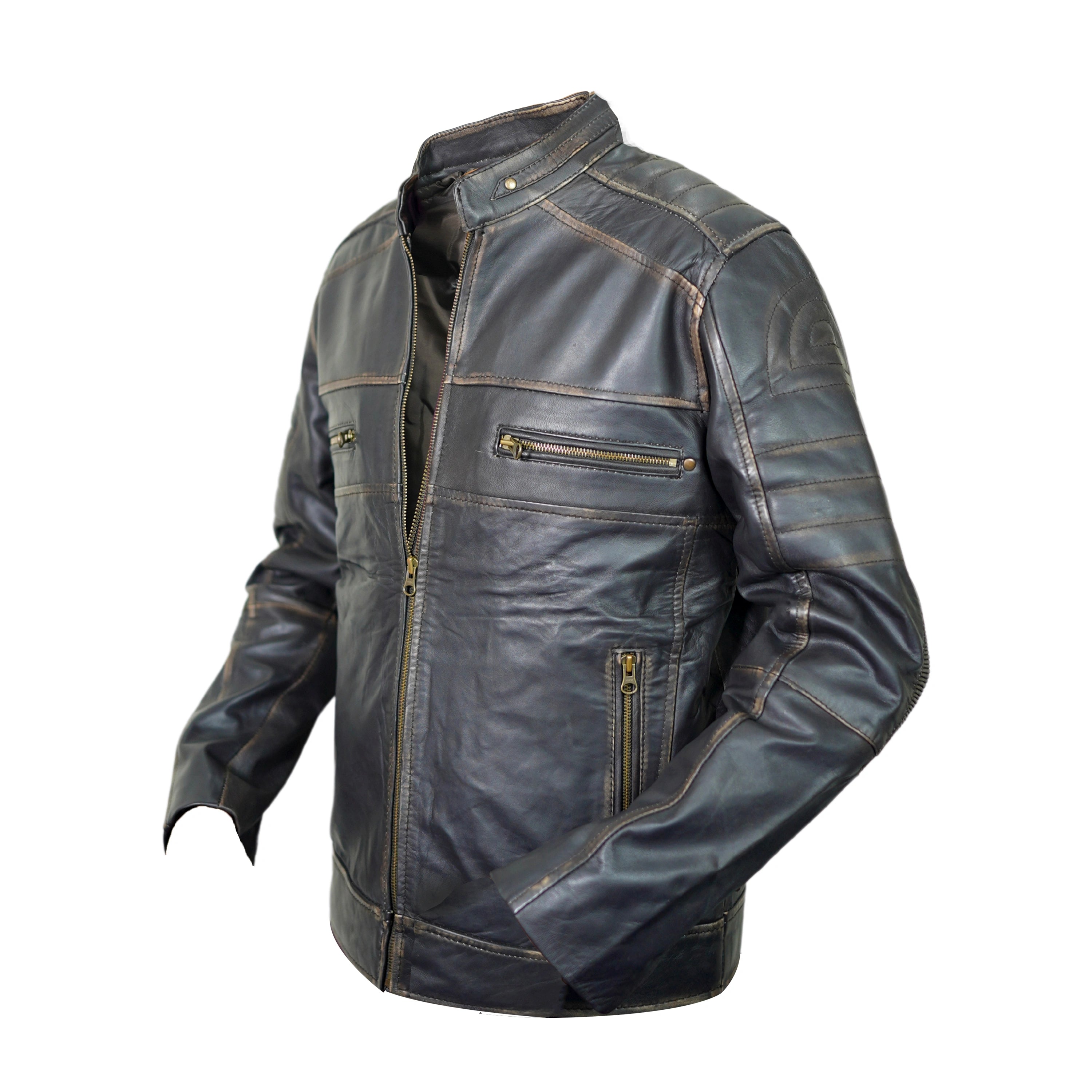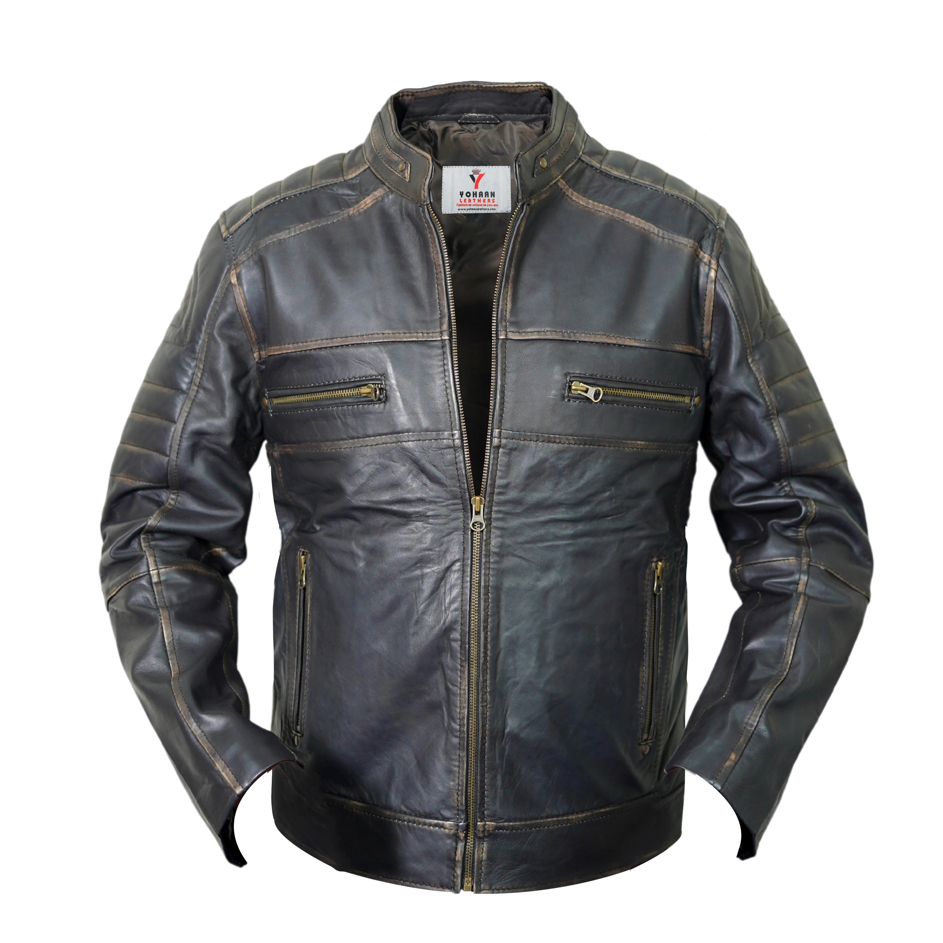 Men’s vintage leather jacket, distressed black biker jacket, slim fit motorcycle jacket, genuine leather outerwear, rugged moto jacket, stylish leather jacket for men.